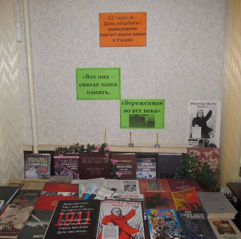 Указом Президента Украины № 1245 от 17 ноября 2000 года день 22 июня отмечается как День скорби и чествования памяти жертв войны в Украине. К этой дате в читальном зале библиотеки им. М. Лермонтова ежегодно проходят массовые мероприятия. В этом году оформлена книжная выставка «Вот она - святая наша память, сбереженная на все века». На выставке представлены книги, посвященные скорбной дате, и периодические издания о начале Великой Отечественной войны.